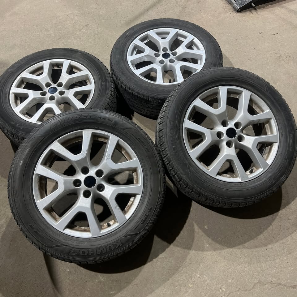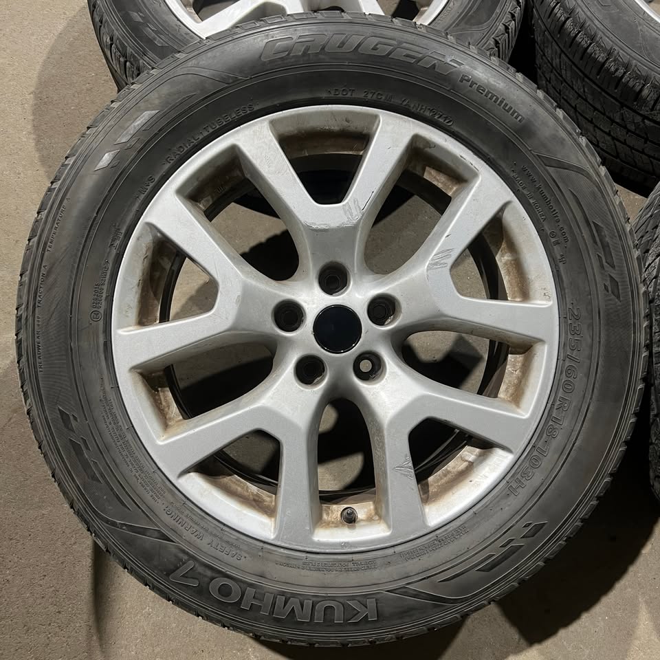 Description: Set of four 235/60/18 Kumho Crugen Premium all season tires mounted and balanced on aftermarket aluminum alloy rims 5x114.3 +40 67.1. Tires have about 70% tread remaining.